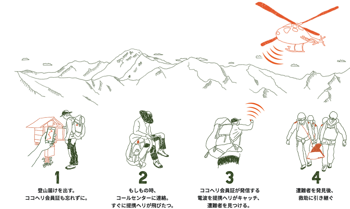 本サービスは、①専用発信機と②捜索ヘリの総合サービスを会員に提供します。同時に、提携しているオンライン登山届け「コンパス」を併用することで遭難発生→救助・搬送までの時間を劇的に短縮することが可能となります。