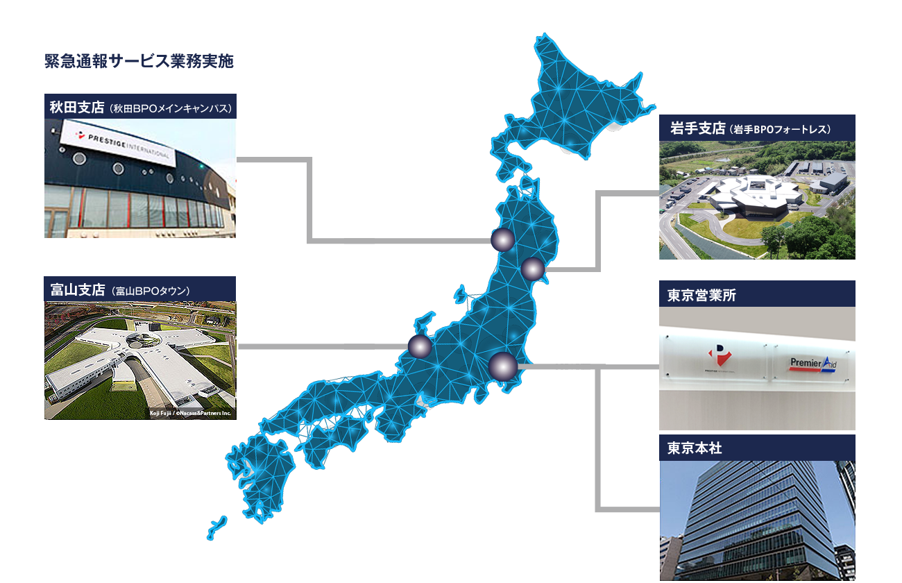 株式会社プレミア・エイドは富山・秋田に主要コンタクトセンターの拠点があります。BCP(事業継続計画)の観点より拠点を分散させ、万が一災害が発生し一方の拠点に障害が出た場合でも他拠点で受電できる体制を整え、お客様からの電話に24時間365日対応しております。